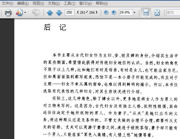 : 引言 第一章:妇者伏也 第一节 夫妻关系 第二节 婆媳关系 第三节 离婚 第四节 贞节 第二章:妾者接也 第一节 妾的来源或种类 第二节 妾的地位 第三节 妾的不幸 第三章:妓者伎也 第一节 妓的种类 第二节 娼妓文化 第三节 妓女的痛苦生活 第四章:“婢”者卑也 第一节 婢女的类型 第二节 婢女的来源 第三节 婢女的地位 第四节 婢女的情感 第五节 婢女从良 第五章:古代妇女缠足文化 第一节 起源与发展 第二节 缠足的原因 第三节 缠足过程 第四节 缠足文化 后记