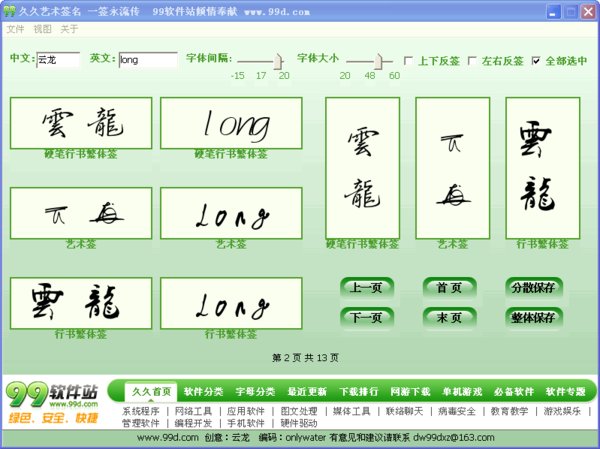 久久艺术签名。这个是本人和一网友在以上两者基础上,自行设计的一款软件。在美观,使用方便,还有字体数量上大大超过前两者。而比起不足的地方也有不少,请期待后续版本。