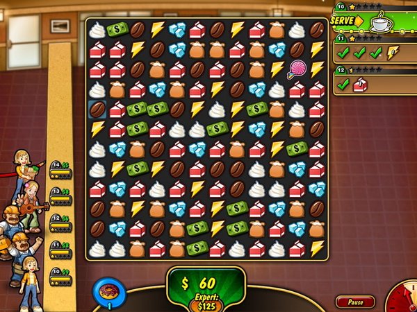 咖啡餐馆又开张了!用丰富的配料咖啡豆、牛奶、糖、冰块等为顾客制作出既丰盛又美味的佳肴吧。一款典型的三三消除续作,中间穿插拼图小游戏,喜欢消除的朋友快来试试吧。
