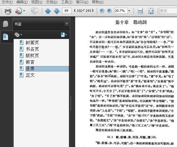 : 第一章 引言 1.1 语法和语法书 1.2 语法的内容 第二章 词类 第三章 句法结构 3.1 主谓结构 3.2 补充结构 3.3 动宾结构 3.4 偏正结构 3.5 并列结构 3.6 分析句子的方法 第四章 句子的基本类型 4.1 体词谓语句 4.2 形容词谓语句 4.3 动词谓语句 4.4 主谓谓语句 第五章 主语、宾语 5.1 主语 5.2 宾语 5.3 准宾语 第六章 修饰语 6.1 名词的修饰语 6.2 动词的修饰语 6.3 形容词的修饰语 6.4 “的”字的另外一些用法 第七章 补语 7.1 不用“得”联系的 补语 7.2 补语的可能式——“得、不” 7.3 用“得”联系的补语 7.4 带“个”的补语 7.5 补语跟宾语、修饰语的比较 第八章 时间词、处所词、方位词 8.1 时间词 8.2 处所词 8.3 方位词 8.4 方位词的引申用法 第九章 几个特殊的动词——“有、是”等 9.1 有 9.2 是 9.3 在、有、是三字用法的比较 9.4 在、象 第十章 助动词 10.1 能、能够、会、可以、可能、得(dé) 10.2 敢、肯、愿、愿意、要、得(děi) 10.3 应、应该、应当、该 …………