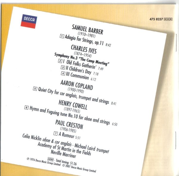 全是美国作曲家的室内乐作品,1976 年初版,这是 2007 年的再版。其中最著名的要算巴伯的弦乐柔板。下面是关于这张 CD 的介绍: