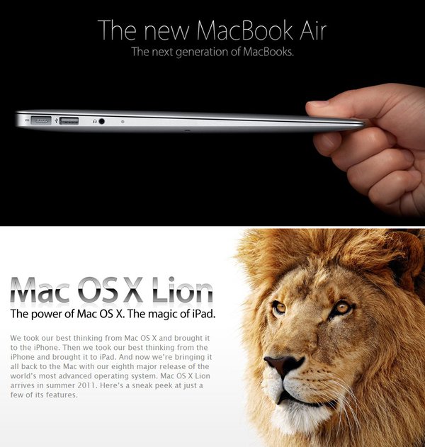 苹果公司于当地时间10月20日上午10点(北京时间10月21日凌晨1点)在美国加州库伯蒂诺该公司园区内召开发布会,会议主题是“Back to theMac”,苹果在本次大会上推出全新的Mac Book Air以及MAC OSX Lion 系统