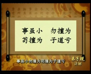 (杨淑芬老师主讲) 辽宁教育电视台录制 共65集 开播时间:2008年12月 《弟子规》原名《训蒙文》,是清朝康熙年间秀才李毓秀所作。李毓秀一生只考中了秀才,是个教书先生,《训蒙文》是他根据自己的教书实际经验编写的一本儿童蒙学读物。后来,这部书被清朝学者贾存仁修订改编,并改名为《弟子规》,一直流传至今。《弟子规》全书以《论语·学而》第六条“弟子入则孝,出则悌,谨而信,泛爱众,而亲仁。行有余力,则以学文”为全书的中心思想,采用三字一句、两句一韵的韵文形式,分五部分编纂成书,具体列举出为人子弟在家、出外、待人接物、求学应有的礼仪与应守的规范。 内容摘录: 辽宁教育电视台—弟子规讲解—01 编号:20081024-01 主讲者:杨淑芬老师 各位电视机前的观众朋友: 大家好! 人一生,与我们最亲密的地方,就是我们温暖的家。所以自古以来,老祖宗就非常重视,我们的家庭教育,因为家庭教育,是一切教育的根本。 人一生,将来能否成就,家庭教育就至关重要。家庭重视了教育,我们的子弟,才能好好地学习。那么,我们家庭教育,首先应该重视什么呢?就是重视品德的扎根。一个人一生有良好的品德,将来才能在世间立身行事,不偏差做人的基本原则、原理,才能做一个好人。 所以,我们翻开历史,源远流长的文化,首先重视的就是家庭伦常。那么在家庭伦常当中,尤其重视的是我们的孝道。孝道如何来开显呢?我们再深入地来探讨,就是从家道、家规、庭训。所以过去的人都有家谱,从家谱里头,我们可以探寻、追根,查到我们家庭它是有祖训的,为什么它能代代承传?就是有家庭的教育。 那么家庭教育确实这么重要吗?确实是非常重要。我们回忆小时候,父母、爷爷、奶奶对我们的教育,我们所看到的,经常是以身作则,做给我们看。所以我们小时候就能在耳濡目染底下,接受老一代的长辈,为我们演述人一生应该如何来处人处事。做人的道理,从小就可以建立起来。那么我们反观,当今社会结构,这样的情形,已经少有见到了。 我们也可以想像、回忆,我们小时候,确实家里的每一个成员,都非常热爱我们这个家,平常我们都会以家庭为重。做任何事情,一定会想到父母,想到我的家族,想到我的家业,所以家风、家道,它就可以代代承传。 我们从历史上,从孔老夫子,从范仲淹,从曾文正公,我们可以看到,他们的家族延续到今天,仍然非常兴盛,那么这也告诉我们,家庭教育的重要性。 回想我小时候,我看到家里的厅堂,上面高挂着「四知堂」。一二三四的「四」,知道的「知」,「堂」就是厅堂的堂。在我识字以后,每天我会仰望着「四知堂」,心里老是在盘算着,「四」代表是什么,「知」又是什么?每天想着想着,有一天终于忍不住了,问了父亲。我说这「四知堂」,代表是什么呢?父亲摸摸我的头,笑一笑,他说:你问得很好。 因为我也到朋友家、同学家去,看到他们挂的堂号,并不是「四知堂」,有西河堂,有锄经堂,有宝树堂,那么这些堂号都不一样,所以引起我心里头很大的疑问。父亲听了以后,他说:每一家,他的姓氏不同,他的堂号就有分别。 那么我就很好奇,接着问:那么我们杨家,为什么叫四知堂呢?父亲说这个问得很好,它是有故事的,有来历的。 父亲讲道:咱们杨家,在汉朝时候,有一位当官的大臣,叫杨震,震就是震惊的「震」,我们平常白话讲地震的「震」,杨震。他有一次,路过一个地方,要派任去当太守。一天晚上,他过去的一位学生,在夜里头,送来了百两黄金,要送给杨震。杨震当时就讲道,我一生为人是清白的,你何必如此呢? 那么学生讲,这个是孝敬老师的一点心意。当时杨震就非常生气,说你不应该如此,学生就讲道,没有关系,反正只有你知我知,没人知道啊。结果杨震非常生气,而且是疾言厉色地告诉他,岂只有你知我知呢?还有天知地知呢。天地鬼神都知道,怎么只有你知还有我知呢? 所以父亲就告诉我:我们做任何的事情,不是只有一个人,或者对方知道而已,天地都知道。那么我当时因为年纪很小,我就知道了,父亲告诉我这个故事,他的用意,就是我们做人要清白。 所以长大以后,我又特别地观察父亲,他很喜欢写书法,在每一幅书法的作品,都盖上了「清白传家」。那么我们也看到了,这样的堂号,自古以来,基本上就是每一户人家,都有的祖训、家规。 那么我们现在,是不是没有这些堂号、家规了呢?其实不然,还是有的。只要我们有意去寻根,都可以寻找到我们老祖宗所留下来,给我们所做的祖训、堂规,甚至是家号。它的用意,就是垂范后世的子孙,让他们都能接受上一代的教诲,把家道代代地承传下去。 那么我们现在,如果我们也很想,兴旺我们的家,兴旺我们的家风、家道、家业,或许我们会疑惑,那么我们以什么来做标准呢?在这里,向诸位朋友介绍了《弟子规》这一本书,请看《弟子规》。 《弟子规》,我们从它的字义来讲,「弟子」就是指的是学生。或许有人会说,啊,这是小朋友学习的,我都已经成年人了,小朋友学了就好。其实不然,因为我们要把家里的孩子教育好,首先,做父母的,做长辈的,就要来学习,我如何把我的为人处事做得好,我才有能力做好模范,教育我的子女。 所以这个《弟子规》,「弟子」两个字,从家里来讲,我们作为父母的子女,就成为弟子,在家弟子。因为我们上面还有长辈,还有祖父、曾祖父。那么我们在学校,我们就是老师的弟子,老师的学生。我们再广