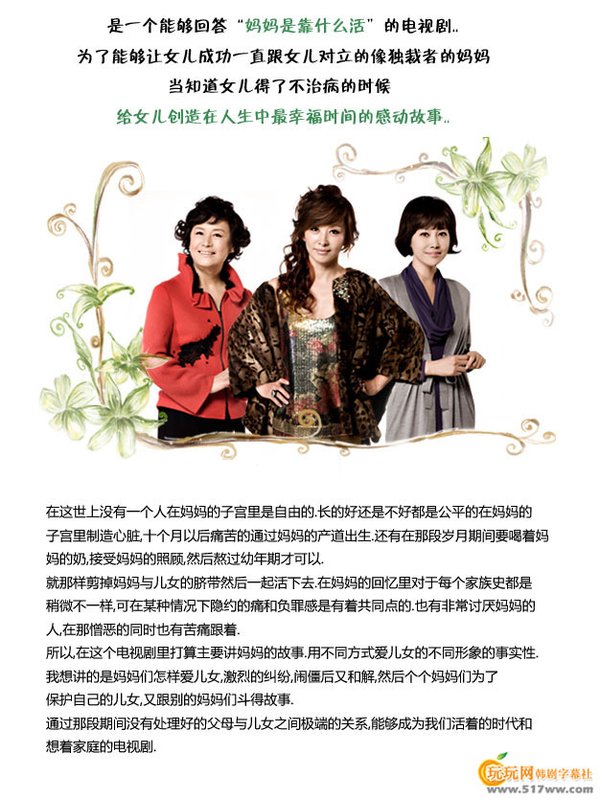 】:是一个能够回答“妈妈是靠什么活”的电视剧..为了能够让女儿成功一直跟女儿对立的像独裁者的妈妈 当知道女儿得了不治病的时候,给女儿创造在人生中最幸福时间的感动故事..