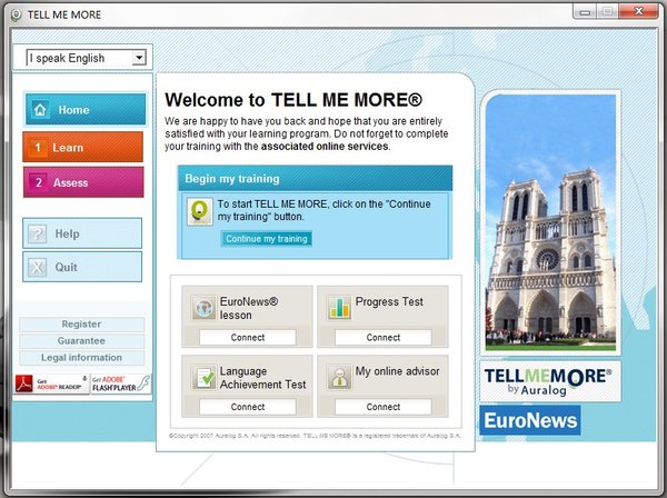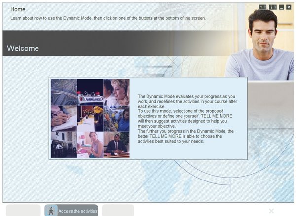 TELL ME MORE是一套完整的电脑化外语学习 E-Learning 解决方案,教学内容涵盖掌握一门语言的各种能力:口语表达、书面表达、阅读、听力和文化背景知识,语言级别从初学者到专家级。 TELL ME MORE是一个全面的外语教学方法,提供丰富多彩的教学内容,采用多媒体技术,使教学过程更灵活更富有互动性。通过多种不同的练习方式,Tell Me More致力于从根本上提高语言交流能力: 听力、表达、写作以及词汇和语法。 在模拟真实语言环境下,通过TELL ME MORE可以轻松掌握语法,词汇,发音和动词变换等语言要素,从而提高这些语言交流能力。