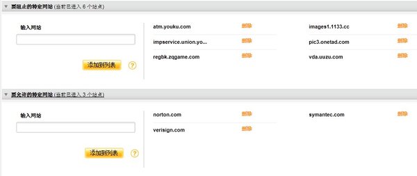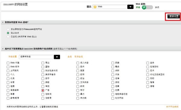 5.选择阻止网站类别(我只选择了广告),设置黑名单白名单...记住,,设置完成之后别忘记点"更新设置"了,这样才能保存