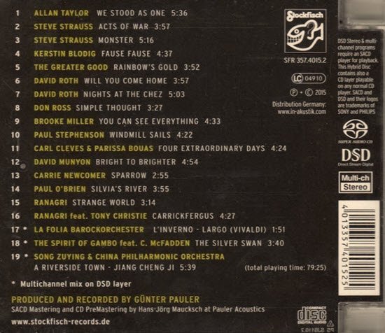 CLOSER TO THE MUSIC VOL.5 Just as it’s four predecessors did, the compilation „closer to the music Vol.5 “ provides an aural overview of the latest and the forthcoming Stockfisch productions - this time for 2015. More than 79 minutes of unusual recordings and fascinating music. Starting off with introductions to the soon-to-be-released albums: Closer To The Music Vol.4 The Norwegian singer/songwriter/guitarist KERSTIN BLODIG presents her debut-album on Stockfisch. The recordings took place in a clearing in one of Germany’s largest forest areas - in Solling. The rich natural atmosphere - including birdsong & sounds from the vegetation - fits wonderfully to Kerstin’s haunting Norwegian songs and soulful acoustic-guitar playing. We have already had the pleasure of experiencing guitar legend DON ROSS as accompanist for Brooke Miller in Northeim, and now he has played in his own solo-CD. This is virtuoso guitar music coupled with a warm voice, including a cover of Sting’s “If You Love Somebody”. Stockfisch is particularly proud and happy to welcome the famous American singer-songwriter CARRIE NEWCOMER to the fold. Her rich velvety voice and heartfelt songs captivate audiences world-wide. A further international star was in Northeim: TONY CHRISTIE - yes the Tony Christie! He came to the Stockfisch studios together with the musicians from RANAGRI to make an album of Irish songs. Tony has strong Irish roots and interprets the songs with his very individual voice supported by wonderful acoustic arrangements. But recent productions also enrich the sampler „closer to the music Vol.5“: Naturally ALLAN TAYLOR is of course represented with a song song of his last album “All Is One”; the New York songwriter STEVE STRAUSS presents his 3rd Stockfisch album and established popular label stars DAVID ROTH and PAUL STEPHENSON let us hear excerpts from their current albums. A very special part of this compilation are tracks 17 to 19, not just because they come from the the so-called “classical music” genre, but also because of the sound-technical aspect - a true wealth of sonic treasures - which we wanted to present to you. The LA FOLIA BAROCKORCHESTER played in violin concertos - by Vivaldi and Brescianello. Each instrument was played by only a single player - “closer to the music” par excellence! With our friends from The SPIRIT of GAMBO we went to Haarlem (NL) and did the very first (!) recording ever of the complete “First Set of Madrigals and Mottets of 5. parts“ by Orlando Gibbons. Last and certainly not least we present a piece by China’s most famous female singer, SONG ZUYING, whose album we recorded in Bejing. At the recent 57th Annual GRAMMY awards (2015) this SACD was nominated in the category “Best Surround Sound Album”. Product Details Audio CD (January 15, 2016) Number of Discs: 1 Format: Hybrid SACD - DSD Label: Stockfisch ASIN: B00TT964WQ