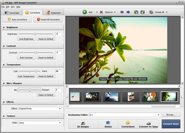 Make quick adjustments - resize, rotate, apply auto-correction settings. Select between a number of effects. Get your pictures ready to be printed or uploaded to websites