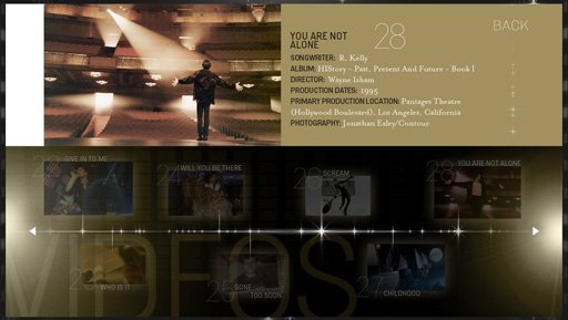 在这超过40部经典音乐录影中,其中有十部是之前没有正式发行到任何DVD上的。而它们和其余所有经典录影,此次都被重新加工。值得一提的是,这套录影典藏套装里,将首度向世界曝光从未发表的《再爱一次》(One More Chance)音乐录影。《再爱一次》是杰克逊生前最后一部真正由他自己拍摄的音乐录影,可惜因为2003年被人诬告的娈童案,而尘封至今。