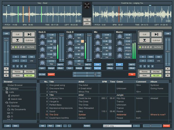 - classic DJ setup with 2 decks, pro mixer and playlists