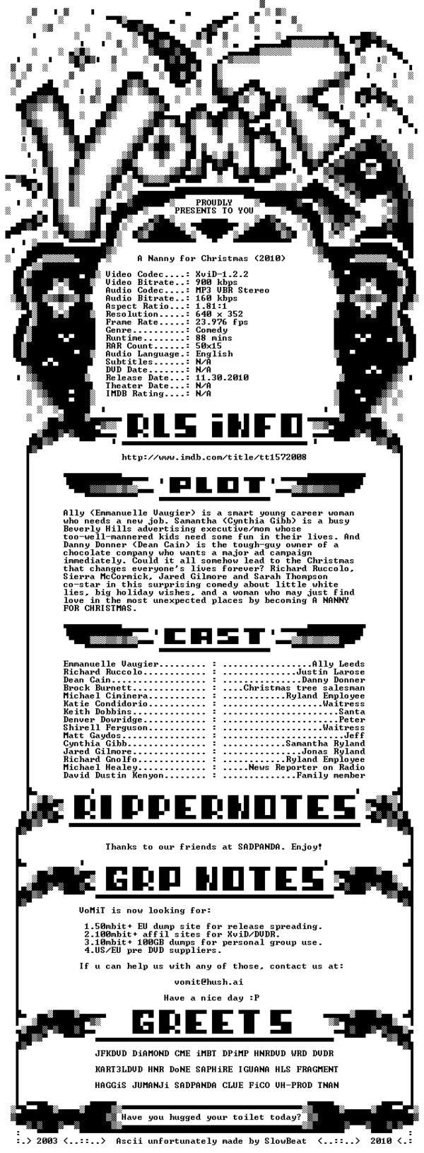 Ally是一个聪明的年轻职业妇女,需要一个新的工作。Samantha是一个繁忙的比佛利山庄的广告主管。Danny Donner是一个谁想做重大的广告活动的巧克力公司所有者。 Ally (Emmanuelle Vaugier) is a smart young career woman who needs a new job. Samantha (Cynthia Gibb) is a busy Beverly Hills advertising executive/mom whose too-well-mannered kids need some fun in their lives. And Danny Donner (Dean Cain) is the tough-guy owner of a chocolate company who wants a major ad campaign immediately. Could it all somehow lead to the Christmas that changes everyone's lives forever? Richard Ruccolo, Sierra McCormick, Jared Gilmore and Sarah Thompson co-star in this surprising comedy about little white lies, big holiday wishes, and a woman who may just find love in the most unexpected places by becoming A NANNY FOR CHRISTMAS. 代码 PROUDLY PRESENTS TO YOU A Nanny for Christmas (2010) Video Codec....: XviD-1.2.2 Video Bitrate..: 900 kbps Audio Codec....: MP3 VBR Stereo Audio Bitrate..: 160 kbps Aspect Ratio...: 1.81:1 Resolution.....: 640 x 352 Frame Rate.....: 23.976 fps Genre..........: Comedy Runtime........: 88 mins RAR Count......: 50x15 Audio Language.: English Subtitles......: N/A DVD Date.......: N/A Release Date...: 11.30.2010 Theater Date...: N/A IMDB Rating....: N/A