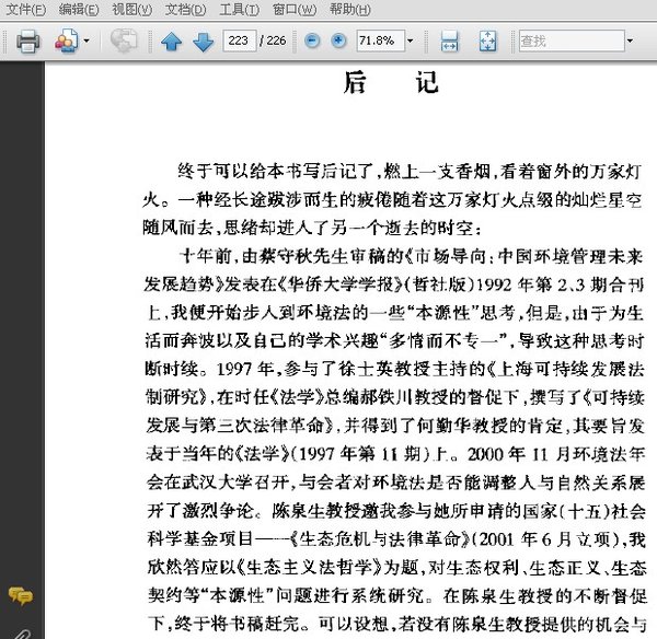 作者的研究视角和方法颇具独到性,对环境法的性质分析,提出了着重从第三法域——社会法与第四法域——生态法探索的观点;对生态权利与生态主义,提出了自然权利与自然公平是基础性权利与“底线公平”,并主张以此来界定与审视其他生态权利与生态正义;通过对生态人的提炼,构造生态法人之概念,借以推动生态维护事业;主张建立在动态的社会契约论基础上的生态契约论,对环境公共信托理论等观点进行反思;主张建立生态资本的储备与投资机制;主张建立自然债清偿机制中的生态责任机制。总之,本书新意迭出,对法学研究与立法,都极具有参考价值。