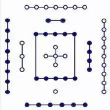西方:四个黑点在内,九个白点在外,表示白虎星象,五行为金。