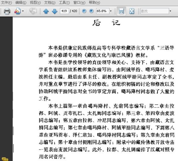 本书是在学校领导的直接领导和关心、支持下,由藏语言文学系负责组织该系教师集体编写的。由阿绒甲措、噶玛降村、麦波担任主编。最后由系主任、副教授阿绒甲措同志审定了全书,并对重点章节进行了详尽的修改。在组织初稿的讨论和修改以及协助阿绒甲措同志对全书的审定方面,噶玛降村同志做了大量的工作。