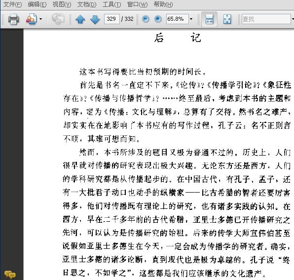 传播,与人类一起产生,一起发展,它需要文化,也需要理解。本书在整个人类文化发展的宏大背景中,从历史和现代科技的发展探讨和阐述了传播学的发展和理论,对中国和西方的传播思想作出比较,并对现代传播手段作出分析和论述,对传播学作出历史的、较为全面的考察和研究,视野广阔,语言生动,值得一读。