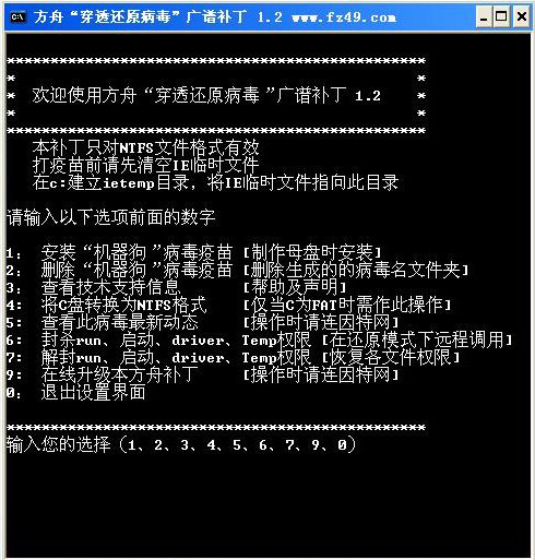 本软件设置注册表权限及系统目录为只读,使病毒无法感染系统,达到疫苗的效果,对未知的变种有着主动防御能力。且本疫苗并不占用任何系统资源,丝毫不会象防毒软件那样占用大量系统资源。补丁使用方法:1、在制作母盘时,在安装所有驱动和软件后,安装本补丁。在本补丁主界,按“1”安装“机器狗”病毒疫苗;若是正在使用的系统,可以在解还原状态下,安装本补丁,也可以将补丁放在服务器一共享目录,用arkhy1 1远程调用安装。安装后,这样可以防止目前所知所有的“机器狗”病毒;2、若病毒变种,本补丁还没升级时,可以采用开维护通道或远程调用直接在还原模式arkhy1 6直接封杀病毒可能生成运行通道,由于是在还原模式下调用,所以若不调用,重启所有封杀权限的目前自动失效。