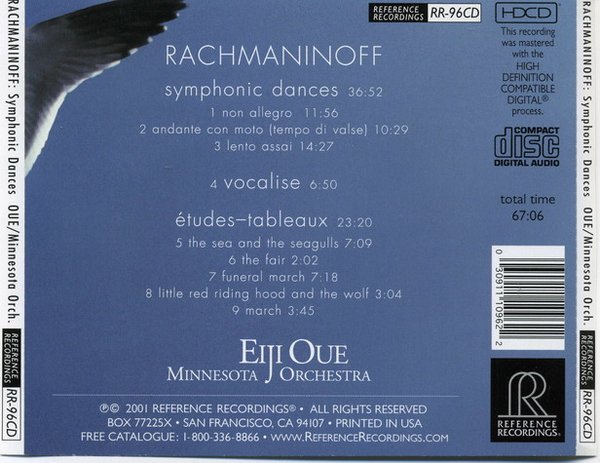 : 交响舞曲 (Symphonic Dances) Op.45(1940) 01 Symphonic Dance No.1: non allegro 第一乐章“不甚快板” 02 Symphonic Dance No.2: andante con moto (tempo di valse) 第二乐章“稍快行板︰圆舞曲节奏” 03 Symphonic Dance No.3: lento assai(Allegro vivace) 第三乐章“甚缓板─活泼快板” 04 Vocalise l练声曲 钢琴音画练习曲(作品第39号 1916-1917): 05 Etude Tableaux: Seagulls 音画练习曲:甚慢板,a小调,海洋与海鸥(2) 06 Etude Tableaux: the fair 音画练习曲:甚快板,b小调,市集场景(4) 07 Etude Tableaux: funural March 音画练习曲:广板,c小调,送葬的队伍(7) 08 Etude Tableaux: little red riding hood and the wolf 音画练习曲:快板,a小调,小红帽与野狼(6) 09 Etude Tableaux: march 音画练习曲:中庸的快板,进行曲速度,D大调,称为“东方进行曲”(9) 感谢 jerry20000 网友的翻译整理!