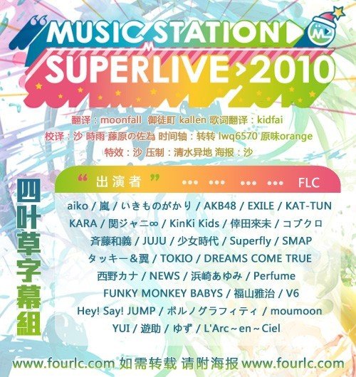 【节目名称】:MusicStation SuperLive2010 【日文名】:ミュージックステーションスーパーライブ2010 【官 网】:http://www.tv-asahi.co.jp/music/index.html 【播出时间】:2010-12-24 【格 式】:rmvb 【语 言】:日语 【制 作】:四叶草论坛 【翻 译】:moonfall 御徒町 kallen 【校 译】:沙 时雨 藤原の佐为 【歌 词】:kidfai 【时间轴】:转转 lwq6570 原味orange 【特 效】:沙 【压 制】:清水异地 【简 介】
