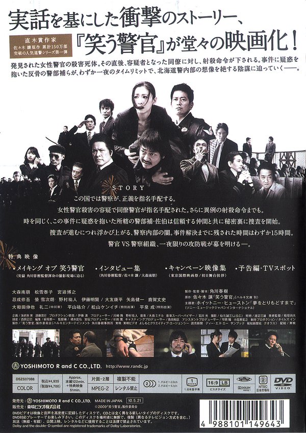 ◎幕后花絮 本片改编自累计销量超过一百万部、被称为警察小说的金字塔的“道警系列”的第一部,同时也是最具人气的一部——《微笑警察》。原作者佐佐木让,曾凭借《警察之血》入围第138届直木奖,还获得了“2008年度这本悬疑小说了不起”。对警察内部了如指掌的他,以发生在02年的北海道警察贪污事件为基础,创作出《微笑警察》。 与普通以警察为主角的故事不同, 《微笑警察》针对警察组织内部腐败,寻找何为“正义”。故事中警察,既是追击者,又是被追击者。 曾经的出版界大公子、日本商业大片名制片角川春树,担任《微笑警察》的导演。七十年代,从去世的父亲那里接手“角川书店”后不久,角川春树凭借《犬神家族》一片正式踏入电影界。之后,他又联手合作深作欣二、佐藤纯弥、泽井信一郎等导演,逐步缔造出风云二十年的角川大片时代。93年,处于事业顶峰的角川,因违反了毒品取缔法而被捕,04年,假释出狱后,他立即作回了电影制片,并在二战题材影片《男人们的大和》中享受口碑与票房双丰收。但是,角川接连在《苍狼》、《椿三十郎》失败,以至于《用心棒》的翻拍计划胎死腹中。急于证明宝刀未老的角川,干脆亲自上阵当导演,宣布执导《微笑警察》。 本片是角川自1997年《穿越时空的少女》之后,时隔十二年再度担任导演。同时,他还兼任影片的制作人,亲手改写电影剧本,并大胆挑战长镜头拍摄。数次遭受失败的角川,在影片上映前宣布,如果观众人数未达到150万人次,就从此退出影坛。 聚集角川麾下的是一批日本电影实力派代表演员。针对北海道警方高层展开秘密搜查的主人公佐伯,由大森南朋扮演。出身演艺世家的大森,今年上半年在电影《秃鹫》中商界精英的形象,令观众记忆犹新,下半年又在《微笑警察》中变身为正义警察。去年在《嫌疑犯X的献身》中有过出彩表演的松雪泰子,出演佐伯身边不可或缺的女搭档小岛百合,除了本片以外,松雪还在今年推出了《余命》、《不沉的太阳》、《结婚欺诈师》等数部重要作品,在各种类型片中的大展演艺魅力。重要配角阵容还包括,被当作第一嫌疑犯通缉的津久井警察的扮演者宫迫博之,扮演新人警察的忍成修吾,老警察萤雪次朗,刑事部长鹿贺丈史等等,曾与角川在《男人们的大和》中有过密切合作的松山健一,还有精彩客串。 影片请来惠特尼•休斯顿献声主题曲《I Didn't Know My Own Strength》。 引用