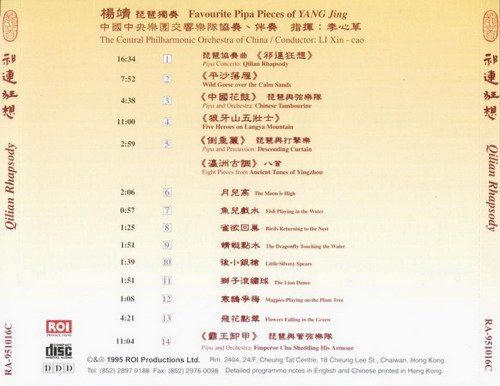 杨靖的琵琶演奏以理性把握及再创造来追求形神统一的朴素自然美,在刘德海教授的指导下掌握了全面的技术,文曲奏来细腻深邃,武套则巾帼不让须眉。十五岁在全国琵琶比赛中初露锋芒,继而在全国多项比赛中夺标,九五年更获国际民乐大赛琵琶组第一名。她为本辑首录了《祁连狂想》、《中国花鼓》等曲,精彩处值得细细品味。