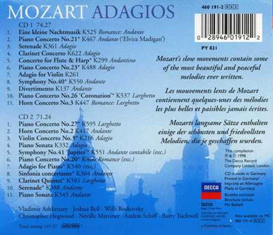 “This 2 CD compilation has a number of the greatest adagios Mozart composed, performed by some of the greatest conductors and musicians in the world. Mozart was such a prolific composer of incredibly beautiful music in his short 35 years that one can easily imagine a second 2 CD set of his adagios in this series. The quality of the performances and the sound quality of the recordings on both CDs are outstanding. The selections of adagios are a representative sampling of many of Mozart's most well-known and greatest compositions. Although the selections come from a large variety of works, they flow smoothly from one to the other. The adagios from the piano concertos performed by Vladimir Ashkenazy, the other piano selections, performed by Andras Schiff, the violin adagio performed by Joshua Bell, and the adagio from the Clarinet Concerto performed by Gervase de Peyer, are absolute musical heaven. Then again, all of the selections are outstanding. ”