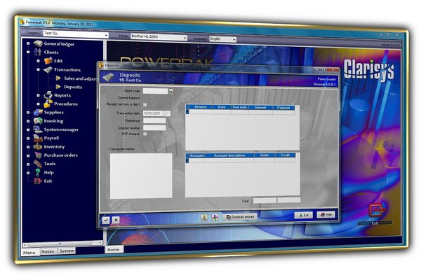 Powerpak includes: General Ledger, Clients, Suppliers, Inventory, Distribution Invoicing, Purchase Orders, Sales Statistics and Purchase Statistics.