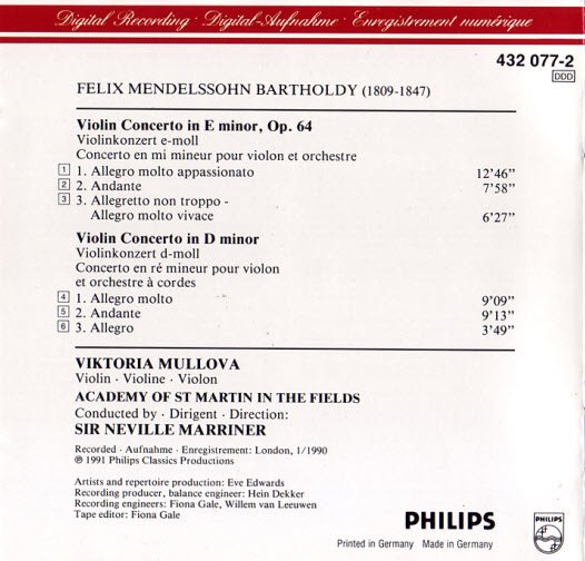 The disc also includes the youthful D minor Concerto, a nice bonus when it is so well played. Of course there are myriad excellent performances of the E minor work. Nathan Milstein always had a special feeling for It; and such players as Fritz Kreisler, Joseph Szigeti, Mischa Elman, and Yehudi Menuhin always seemed to get more out of the serious moments than their colleagues, while not quite competing in the finale. Mullova herself has made a second recording, without managing to trump this one.