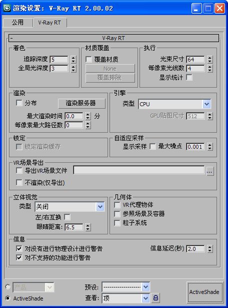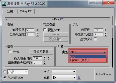 说明: 1.VRay-RT的实时渲染,可以使用CPU和GPU完成,要进行二者的切换,一定要先关掉渲染结果的帧缓存,选OpenCL就是进行GPU渲染。 2.目完VRay-RT的实时渲染,还受许多限制,许多材质类型及渲染效果还得不到支持,还不能做为出图的最终渲染,其渲染结果跟产品级渲染还没法比,适用于简单材质的产品效果的预视,对材质及场景复杂的建筑效果图来说,没有太大的实用价值,不过对于使用双显卡,双显示器的用户,可以在使用一个显卡做图的过程,用另一个显卡来渲染大效果,也是很好玩的事啊! by Ma5