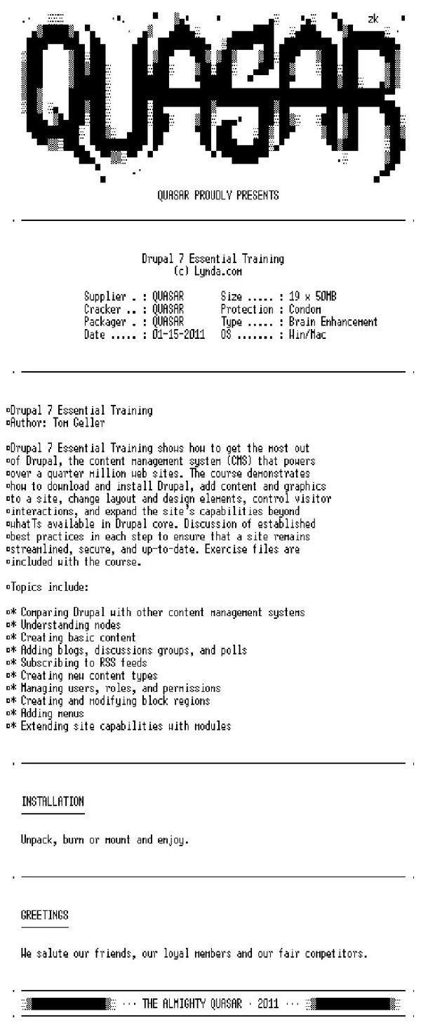 Course name: Drupal 7 Essential Training Author: Tom Geller Duration (hr:min): 7:25 Released on: 1/14/2011 Exercise files: Yes Software works on: Mac and Windows Drupal 7 Essential Training shows how to get the most out of Drupal, the content management system (CMS) that powers over a quarter million web sites. The course demonstrates how to download and install Drupal, add content and graphics to a site, change layout and design elements, control visitor interactions, and expand the site's capabilities beyond what’s available in Drupal core. Discussion of established best practices in each step to ensure that a site remains streamlined, secure, and up-to-date. Exercise files are included with the course. Topics include: Comparing Drupal with other content management systems Understanding nodes Creating basic content Adding blogs, discussions groups, and polls Subscribing to RSS feeds Creating new content types Managing users, roles, and permissions Creating and modifying block regions Adding menus Extending site capabilities with modules