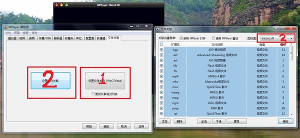 在点文件关联,若是windows7先点1,进行关联设置,看看关联图标有没有变,若没有,在点2,看3的地方。最后点确定就好,再看看关联图标有没有变,有时候是系统缓存,重启一下就基本上搞定了