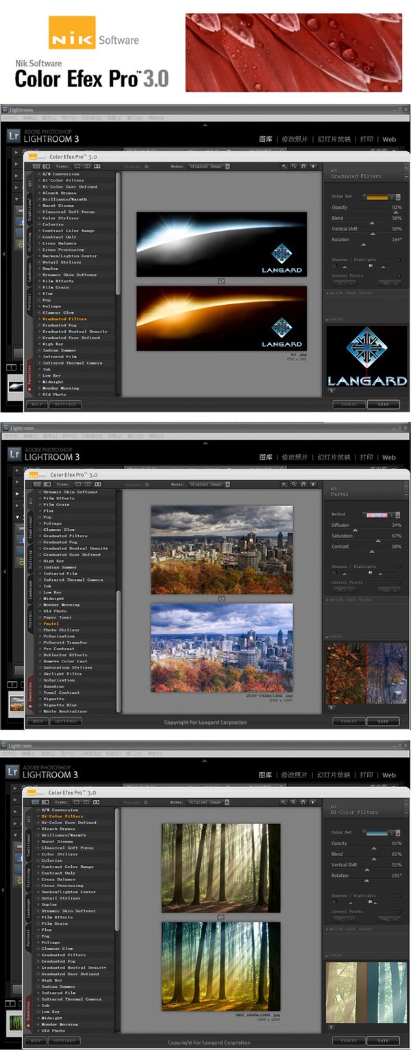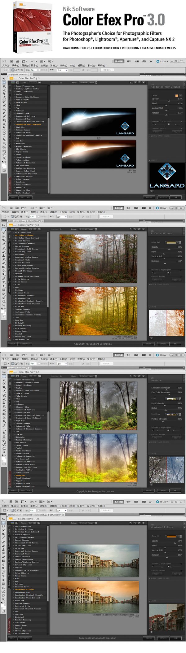Nik Software Color Efex Pro™ 3.0 为你提供了一套相当完整的插件,从细微的图像修正到颠覆性的视觉效果.Nik Color Efex Pro允许你为照片加上原来所没有的东西,比如“Midnight Blue”功能可以把白天拍摄的照片变成夜晚背景。“Infra-red Black and White”功能可以十分真实地模拟红外摄影的效果。“Sunshine”功能则能让原本灰暗的画面获得阳光明媚的效果。“True Light”技术允许你像处理传统胶片一样去处理数码照片中的光学感应效果。