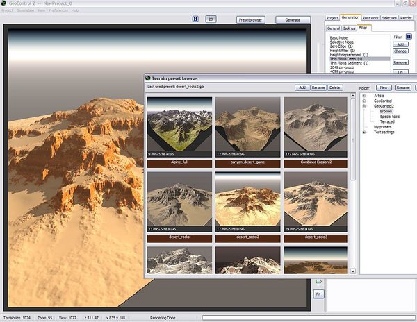 GeoControl 创造性地控制的景观形式是没有损失的,你可以创建,随后调整,关闭或更改等值线或层。艺术的“形”过滤器提供全面的景观,像典型的丘陵或山脉脊结构。半侵蚀算法把这些科学幻想变成现实,河流甚至河网可以添加到地形。该算法是独一无二的,极值快速。你可以使用它来整合的道路,城市地区,甚至控制河流。
