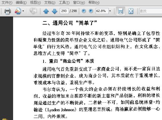 : 第一章 再造通用文化 第一节 通用电气的企业文化 一、通用文化历程· 二、雷吉·琼斯的通用 第二节 杰克·韦尔奇的通用时代 一、文化革命 二、简单型文化 三、韦尔奇的道路 第三节 大公司的文化力 一、企业文化——推动公司发展的文化力 二、大公司的文化之旅 第二章 简单的管理文化 第一节 热爱变革 一、面对现实 二、变革创造机会 第二节 “领导”公司 一、淘汰“管理者” 二、“最简单的职业” . 三、“领导者”的素质 第三节 信赖员工 一、下放权力 二、“允许失败” 第三章 精简的组织文化 第一节 组织的一致性 一、团队精神 二、行动一致 第二节 无界限的组织 一、共同分享 二、削减层级 三、“群策群力” 第三节 变“小”的通用电气公司 一、向官僚主义宣战 二、小公司的灵魂 三、通用电气的规模优势 第四章 简明的价值文化 第一节 追求卓越 一、“数一数二”的公司目标 二、一流的个人 第二节 共享的价值观 一、诚信至上 二、业绩至上 三、客户至上 第三节 人才的价值 一、寻找最优秀的人才 二、开发员工的潜能 三、重视员工 第五章 简练的学习文化 第一节 永远学习 一、营造学习的氛围 二、树立学习文化 第二节 学习与发展 一、学习他人,化为己用 二、公司的创新 第六章 化繁为简——杰克·韦尔奇的“简单工作” 第一节 将一切简单化 一、复杂是缺乏效率的 二、简单的真谛 第二节 以“简单型文化”为中心 一、企业文化的作用 二、通用公司“简单了”