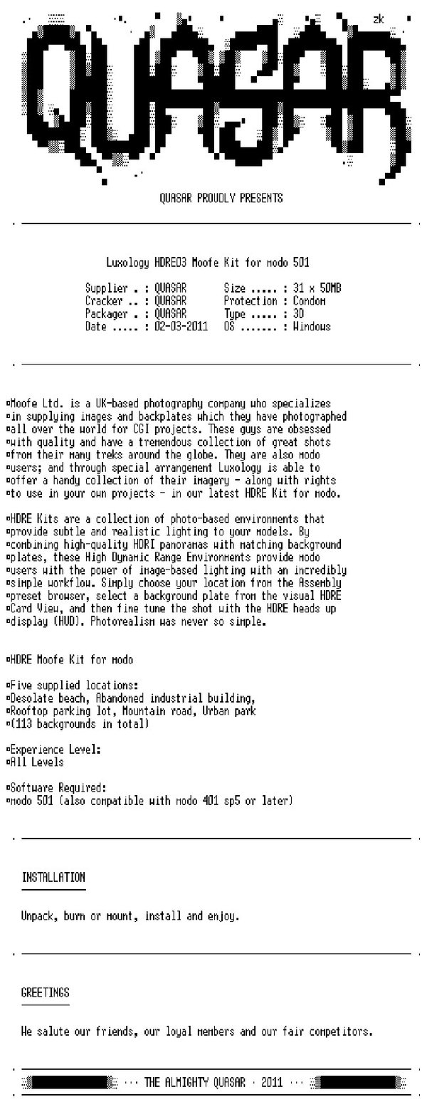 FAQ: Frequently Asked Questions What are these Kits for? They are designed to help you light and place your models in interesting locations with no fuss. Even the simplest models look great with the use of these Kits. They are great for pitching your work, building a portfolio, and learning about HDRI lighting. If you are a professional, the Moofe Kit gives you additional flexibility, in that you have a source where you can license high-resolution images from Moofe for specific commercial use, exclusively if you prefer. For more information on Moofe see below. Which HDRE Kits are currently available? Currently, there are three. We are offering the new Moofe Kit plus the original HDRE Urban and HDRE Landscape Kits. How many locations do I get in these Kits? Each Kit has five locations. The Moofe Kit has 18 - 25 blackplates (for each of the 5 locations) and the Urban and Landscape Kits each have 6 - 12 backplates (for each location). For example, the first location in the Urban kit is an industrial warehouse area. Six backplates are provided for that single location including a wide expanse of asphalt, a cul de sac, a street with adjacent warehouse, a close-up of the street and two more backplates showing a paved area with barricades. The Moofe Kit backgrounds are 3,608 x 2,706 and you can contact Moofe to license even higher resolution backplates, all shot with a Hasselblad H3D Mark II camera. What happens to my existing lights in my scene when I activate an HDRE? All of your lights are still there but they are turned off automatically to make way for the new lighting provided in the Kit. Are these Kits useful for people who do not use modo? The supplied imagery would be useful, but the kits are far more valuable to modo users because we have made the kits extremely simple to use inside of modo through the use of scripts, rigs and custom user interfaces. Is there documentation provided? Yes, we provide extensive video tutorials (English language) which cover how to use the Kits and also how to create custom effects. Who is Moofe and what rights do I get to use their images with the Kit? Moofe Ltd. is a UK-based photography company that specializes in supplying images and backplates which they have photographed all over the world for CGI projects. Through special arrangement, Luxology is able to offer an assortment of their imagery for use with modo. You have the flexibility to use the supplied Moofe images any way you want non-commercially. For example, you can use them to create images for your website, make a pitch to a client, add to your demo portfolio etc. If you need to utilize a image that will be used by a 3rd party (could be a print ad, a billboard or a web graphic etc.), please register at the Moofe website and indicate which image you wish to license. They will provide you a quote for 3rd party use of the image via their website.