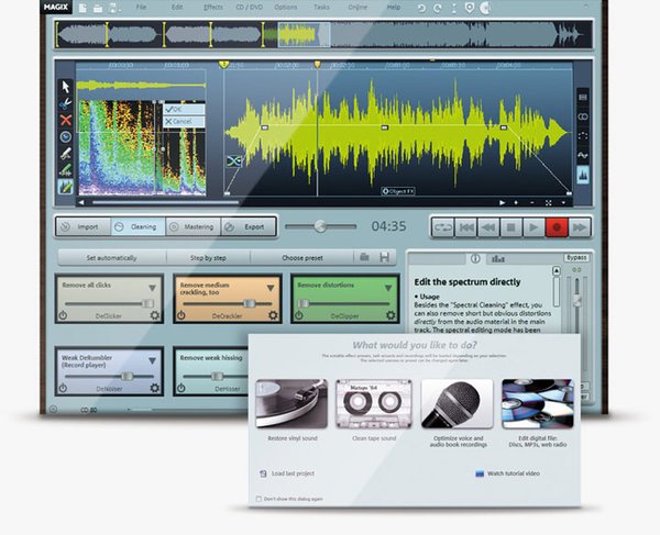 MAGIX 推出的软件Cleaning Lab,它用于将老式唱片机、磁带或者旧CD中的音乐重新修复,具有24-bit高音质、新的环绕声转化、全自动消“嘶”功能,MAGIX的Audio Cleaning Lab帮助你对曾经最爱的音乐进行清理,让它们焕然一新,而后烧录在CD、DVD中欣赏,甚至还可以做成DVD编码的音频格式。