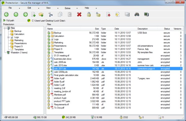 Protectorion encrypts your files, not your hard drive. Neither the formatting of hard drives nor the mounting of drives is necessary. Protect your files and folders with strong encryption. Manage and transport data securely between USB flash drives and hard drives. Create encrypted backup copies of your data. Give your files a description for immediate retrieval when required. Better organize your files by creating file versions. Send encrypted files via E-mail.