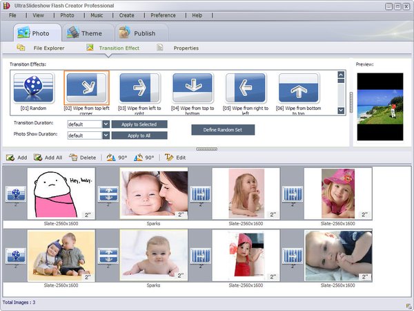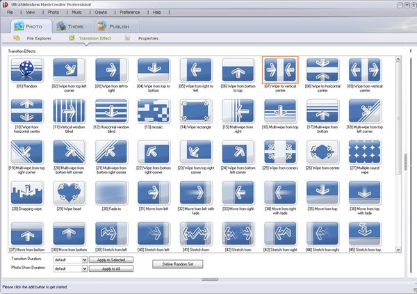 You can choose from Random, Wipe from Left, Fade to White, Cross Expansion and other 60-plus transition effects. Zooming and panning effect is optional for advanced flash templates.