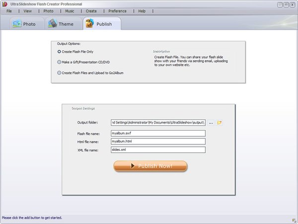 With UltraSlideshow, you can create gorgeous photo flash slideshows for watching on computer, burn the auto-run flash photo album to gift CD/DVD, build a web gallery with amazing flash slideshows with dynamic SWF + HTML + XML files, or upload the slideshows to our free web album Go2Album, and then embed the slideshows to your personal website, MySpace, Blogger, Friendster and many other social networking websites.