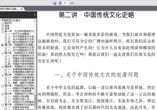 : 第一讲 文化和中国传统文化 一 、 关于文化的解读 二 、 关于中国传统文化的概念及其成因 三 、 关于中国传统文化的特征 四 、 研究中国传统文化的现实意义和世界意义 第二讲 中国传统文化史略 一 、 关于中国传统文化的起源问题 二 、 关于中国传统文化发展的历程 第三讲 中国传统文化中的哲学 一 、 哲学与中国传统文化 二 、 中国古代哲学思想的内涵 三 、 中国古代哲学的特点 四 、 中国古代哲学的精神价值 第四讲 中国传统文化中的伦理道德 一 、 伦理道德发展的脉络 二 、 伦理道德的主要内容 第五讲 中国传统文化中的宗教 一 、 中国古代宗教演变进程 二 、 中国古代宗教文化概述 三 、 佛教 、 道教对中国传统文化的影响 第六讲 中国传统文化中的官制 一 、 中国古代历朝的官制 二 、 中国古代选官制度 第七讲 中国传统文化中的文学 一 、 中国古代的诗歌 二 、 中国古代的小说 三 、 中国古代文学的基本特征 第八讲 中国传统文化中的史学 一 、 中国史学的传统 二 、 中国史学的 “四大史体” 三 、 中国古代主要史书典籍 第九讲 中国传统文化中的教育 一 、 中国古代学校教育发展的沿革 二 、 中国古代学校教育的教学思想 附:参考书目