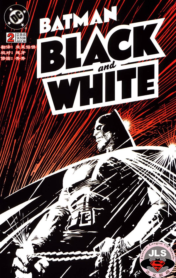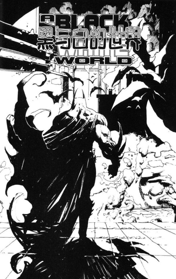 《蝙蝠侠:黑白世界》是DC出版于1996年的三本8页篇幅蝙蝠侠黑白漫画合集,以及一本收录了四期连载的超短篇合订本。前者包括取自《蝙蝠侠:哥谭骑士》的期刊连载以及备用故事,后者则收录了四期连载中的超短篇故事。这个系列包含了DC众多知名作者的作品,对于以彩色著称的美漫而言,纯黑白的画面有着相当大的视觉冲击力,以及同等的观赏性。脱离了上色,原稿的气氛表现的淋漓尽致,而黑白又是如此适合蝙蝠侠的色彩,再加上不少精彩的编剧,让这短短8p充满了情感和闪光点。