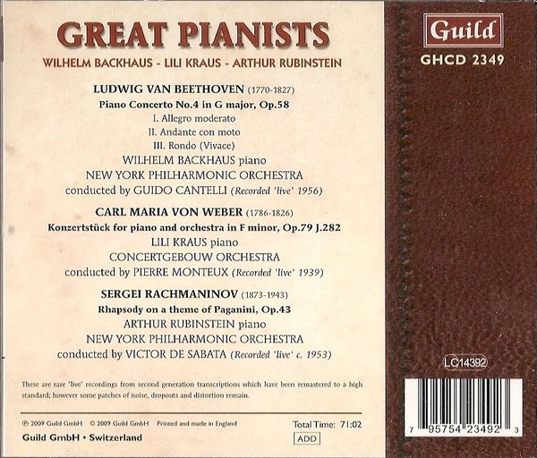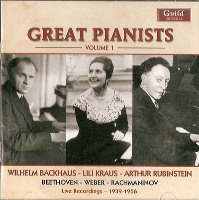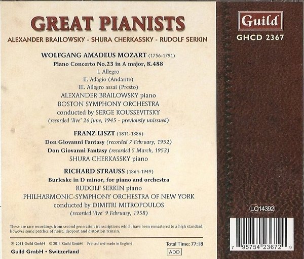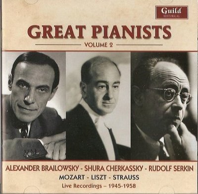 这是由瑞士Guild唱片公司发行的包括Backhaus, Kraus, Rubinstein, Brailowsky, Cherkassky, Serkin共六位钢琴家的现场录音(大部分是),有不少是最新挖掘出来的录音,以前从未出版过,相信对于收集历史录音的音乐爱好者和喜欢老一辈伟大钢琴的朋友来说是两张不可或缺的CD,唯一遗憾的是由于当时录音设备不如现在,所以转录时杂音在所难免,但是此套录音相当难得,相信大伙儿都能谅解了。