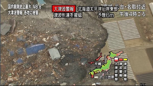 在今日强震发生后,日本随即发布海啸警报,据报导强震后余震不断,在14:06分又再发生规模6.4的强震。传出部分民宅倒塌,东京台场市区、成田近郊千叶市、横滨、池袋、宫城都传出火警,。气象厅发布最高海啸警报沿海150公里都在警戒范围,不久,东北沿海发生10米高海啸,大量海水淹入路道,将轮船、汽车、房屋冲走,海水冲入房屋,画面看起来怵目惊心。东日本铁路其下属所有新干线已经停止运行,成田、羽田机场也已紧急关闭。