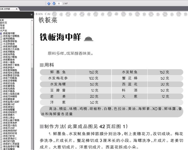 用铁板烹制菜肴又叫“铁板烧”,是一种较为特殊的烹制方法。铁板烧有两种形式。一种是小铁板,其操作程序为:将原料加工成型,经预备烹制(油滑、水煮、油爆、油炸)后,放入事先加热的小铁板中,然后将调好味的滋汁浇入,菜肴里的汤汁遇到滚烫的铁板,发出“嗞嗞”的响声并伴着滚冒的白烟,一时间餐桌上云蒸霞蔚,香气四溢,菜品 热气蒸腾,颇具特色。另一种是大铁板,其操作程序为:将加工后的原料摆放在平整光洁的大煎盘上(其下是加热设备),边煎边调味,用 手铲拨动、翻拌,成菜后装盘,这种烹制形式可作客前烹制( 厨师面对客人进行烹调操作),即烹即食,别有一番情趣。小铁板小巧、方便 ,大小酒楼、食肆均可使用,而大铁板一般在大型酒楼或西餐厅使用。