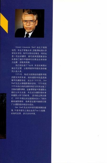 Donald Alexander Sheff出生于美国纽约,毕业于耶鲁大学,后取得哈佛大学研究生学位。他不仅是名优等生,同时也是一名运动健将,曾代表美国国家游泳队参加了赫尔辛基举行的奥运会游泳接力比赛,并取得奖牌。 他已经出版了7本书,并且任美国出版公司主管,以教育家和作家的身份被列入名人录。 1975年,他成为美国纽约摄影学院的院长和所有者,纽约摄影学院是美国最早的摄影学校,成立于1910年。Don Sheff先生从事摄影教学多年,1975年到1979年他为纽约摄影学院写作并出版了全新的摄影课程。这套课程被中国摄影出版社以中文出版,并且成为摄影爱好者和摄影人学习的标准。该书经过两次修订,2009年推出的这套教材加入了新的数码摄影教程,他希望这套书继续引领广大摄影爱好者走向成功。 Don Shelf先生对中国有着深厚的感情,30多年前与上海出生的Tina Ll结婚,在纽约定居,多次访问中国。