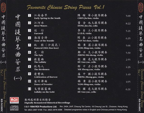 : 01. 江南春早 (陈稼华小提琴独奏) [0:05:11.25] 作曲:朱南溪 小提琴:陈稼华 钢琴:倪振家 录制:一九六三年 02. 江河水 (董金池大提琴独奏) [0:08:29.50] 作曲:东北民间音乐 董金池改编 大提琴:董金池 钢琴:王蕾 录制:一九八三年 03. 送行 (李自立小提琴独奏) [0:05:25.50] 作曲:陈国权 小提琴:李自立 钢琴:周士瑜 录制:一九六三年 04. 海滨音诗 (阎泰山小提琴独奏) [0:06:38.50] 作曲:秦咏诚 小提琴:阎泰山 钢琴:康却非 录制:一九六三 05. 牧歌(沙汉昆) (杨秉荪小提琴独奏) [0:05:06.25] 作曲:沙汉昆 小提琴:杨秉荪 钢琴:巫漪丽 录制:一九五八年 06. 史诗 (郑石生小提琴独奏) [0:05:32.50] 作曲:马思聪 小提琴:郑石生 钢琴:朱雅青 录制:一九六二年 07. 摇篮曲 (胡国尧大提琴独奏) [0:02:59.25] 作曲:贺绿汀 大提琴:胡国尧 竖琴:王政 录制:一九七九年 08. 牧马人 (解中彦小提琴独奏) [0:04:24.12] 作曲:解中彦 小提琴:解中彦 钢琴:朱雅芬 录制:一九六零年 09. 庆丰收 (盛中国小提琴独奏) [0:01:52.38] 作曲:张靖平 小提琴:盛中国 钢琴:吴文俊 录制:一九七六年 10. 塞外舞曲 (杨秉荪小提琴独奏) [0:04:14.12] 作曲:马思聪 小提琴:杨秉荪 钢琴:巫漪丽 录制:一九五九年 11. 戈壁摇篮曲 (胡国尧大提琴独奏) [0:06:36.38] 作曲:王连三 大提琴:胡国尧 钢琴:王绍麟 录制:一九八六年