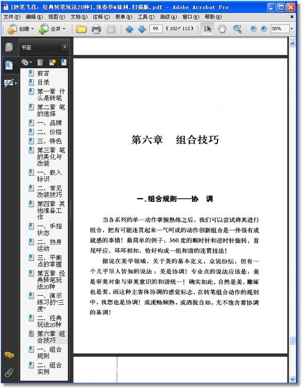 : 序 第一章 什么是转笔 第二章 笔的选择 一、品牌 二、价格 三、特色 第三章 笔的美化与改装 一、嵌入标识 二、常见改装技巧 第四章 其他准备工作 一、手指状态 二、热身运动 三、平衡点的掌握 第五章 经典转笔玩法20种 一、演示练习的“三度” 二、经典玩法20种 第六章 组合技巧 一、组合规则 二、组合实例 后记