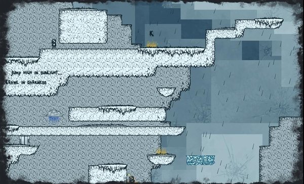 灰暗气氛的游戏,画面和音乐都略带悲伤,有"晴天"和"雨天"的设定,晴天心情好,跳得高;雨天心情不好,能爬沟.