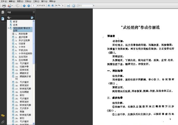 武松脱铐拳是根据武松大闹飞云浦的故事创编而成的拳术套路,这个套路里共有十六种手法,六种腿法,并运用肩、肘、胯多种技击方法,脱铐拳法以腿法为主,手法为辅,结构清晰,技法独特,突出实战,是一套带有情节的另具一格的拳术套路,主要动作有67个。