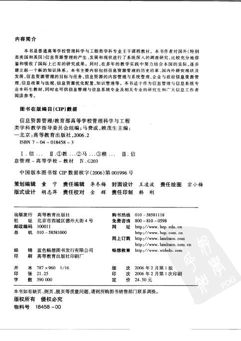 本书是普通高等学校管理科学与工程类学科专业主干课程教材。本书作者对国外(特别是美国和英国)信息资源管理的产生、发展和现状进行了系统深入的调查研究,比较充分地借鉴和吸收了国际上已有的研究成果。同时,在多年的教学实践中努力结合本国的实际,逐步建立起一个新的知识体系。本书主要内容包括信息资源管理的历史沿革、国内外研究现状及发展,信息资源管理的目标与任务,信息资源的内容管理与系统管理,企业与政府信息资源管理,信息政策与法规,信息资源优化配置,知识管理等。本书适于作为信息管理与信息系统专业本科生教材,同时也可供信息管理与信息系统专业及相关专业的研究生和广大信息工作者阅读参考。