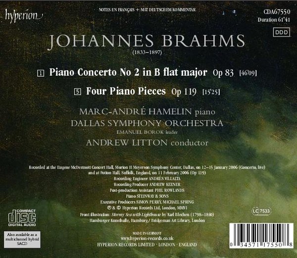 亚马逊网站编辑员:在星光璀璨的钢琴技巧大师星座中Hamelin依旧熠熠生辉;似乎他总能以他无上的技巧和音乐性玩转钢琴文献的任何核心或边缘曲目。这情形在这勃拉姆斯第二协奏曲的现场中体现得无比充分,这是一部巨大的、要求演奏家兼有辉煌的技术和敏锐的诗意的作品。此处Hamelin无疑成为了示范者,尤其在在几乎是伤手的第一乐章中他采取了壮丽宏大的处理同时让丰富而精致的细节兼备。在慢乐章中,他让钢琴旋律无尽而自然地吟唱好像他自己就在键盘上即兴演奏。Andrew Litton和达拉斯交响乐也是录音成功的一个大部份,他们完美地反应给了第一等独奏勃拉姆斯风格的整体音响。这张CD同时也包括了勃拉姆斯作品119,三首清爽明朗的间奏曲和一个强壮的狂想曲,并且都完成得充满节奏感与生气。勃拉姆斯爱好者们将会对Arrau、Serkin和Gilels这样的巨人延续他们的欣赏,但是Hamelin的唱片也值得摆上他们的收藏架。--丹.戴维斯 本人翻译水平有限,语句不通畅处请见谅。 引用 Amazon.com In a star-filled constellation of piano virtuosos Hamelin shines brightly; it seems he can play virtually anything in the core repertory or on its fringes with consummate skill and artistry. That's certainly the case in this live Brahms' Second Concerto, a massive work demanding both virtuosity and poetic sensibility. Hamelin amply demonstrates the former, especially in the finger-busting first movement where he adopts the necessary grand manner while providing filigreed details in abundance. In the long slow movement, he maintains a seamless flow of legato pianism and makes it sound as spontaneous as if he were improvising at the keyboard. Andrew Litton and the Dallas Symphony are a big part of the recording's success too, responsive to the "Brahmsian" ensemble sound while the first-desk solos are done to perfection. The disc also features Hamelin in Brahms' Opus 119 solo pieces, three radiantly played lyric Intermezzos, and a muscular Rhapsody, all done with rhythmic life. Brahmsians will retain their affection for such giants as Arrau, Serkin, and Gilels, but Hamelin's CD belongs in their collections too. --Dan Davis